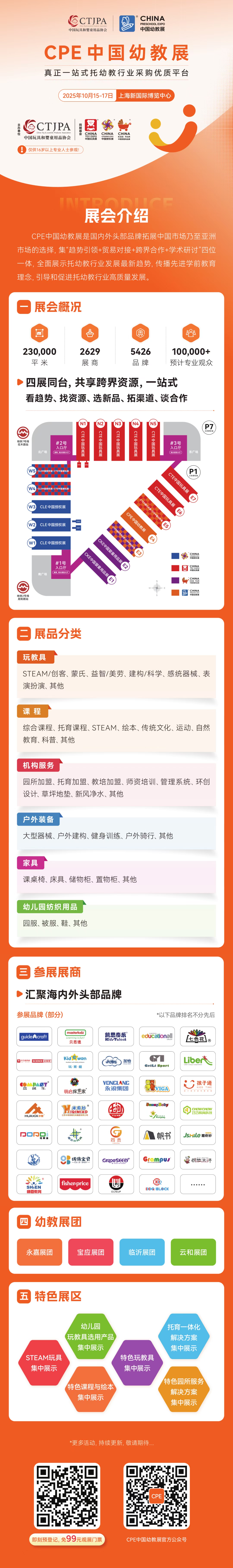 多场行业活动,传播先进幼教理念。包括2025学前教育趋势发布周、2025自然教育与研学生态行业大会、2025幼教新品发布及经销商大会、全球出海 - 海外买家贸易对接会等。聚焦学前教育热点领域,联动产业链各方资源,邀请100+行业顶级专家,共享托幼教前沿理念,进行思维创新,助力行业同仁布局新赛道、把握新机会,为行业高质量发展新格局奠定基础。