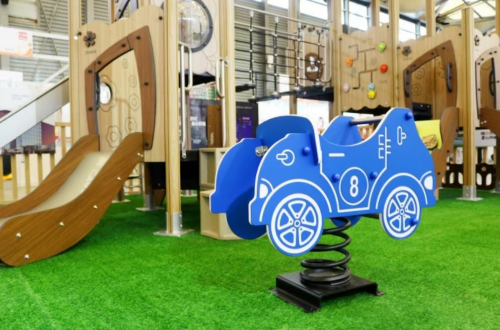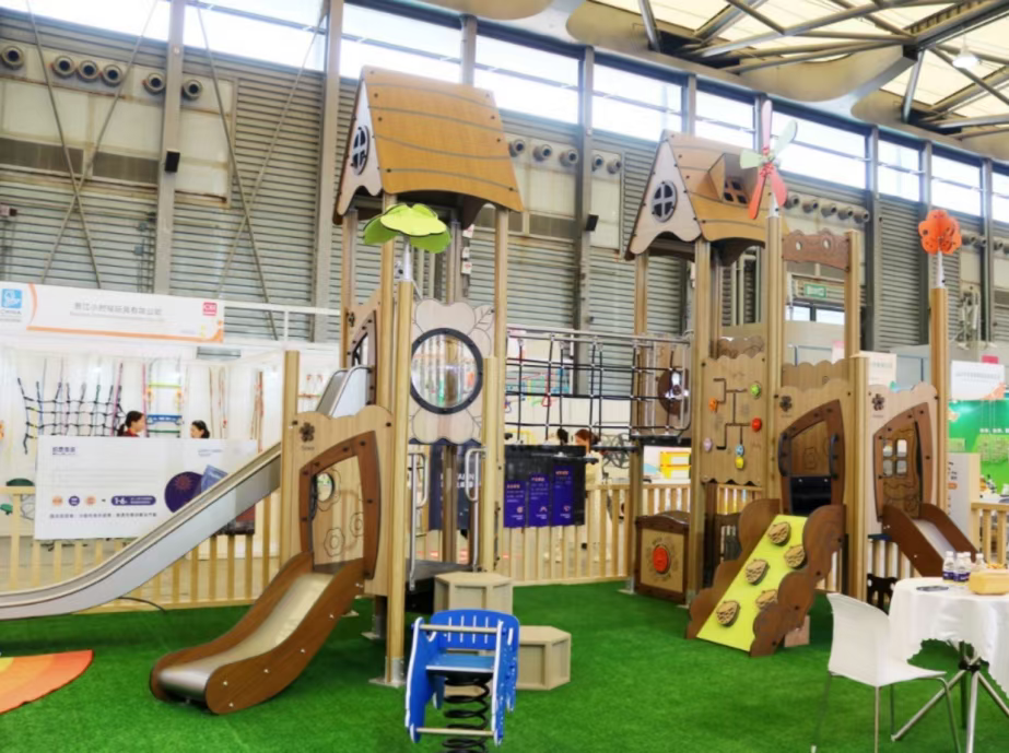 户外游具展示区展示了包括滑梯、攀爬架等在内的多种户外游乐设备。这些产品不仅结构坚固安全,更注重通过创新设计激发儿童的冒险精神,促进身体素质与社交能力的全面发展。该区域的展示为幼儿教育机构提供了完整的户外活动解决方案。