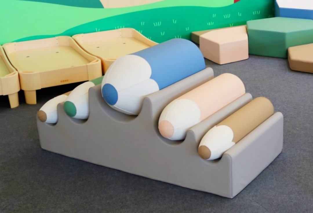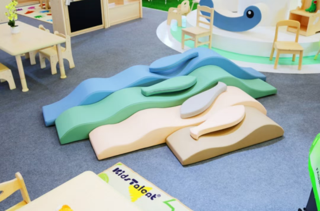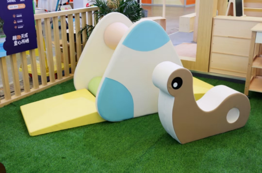 软包家具组合区则突出了安全、舒适与趣味性的完美结合。柔软的爬行垫、色彩缤纷的感统训练组合、创意十足的阅读角设计,为孩子们构建了一个能够自由探索、激发身体潜能的理想空间。该区域的产品特别注重促进幼儿感统能力的发展,体现了其在幼儿发展心理学方面的专业考量。