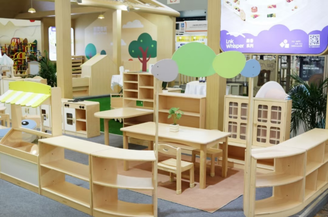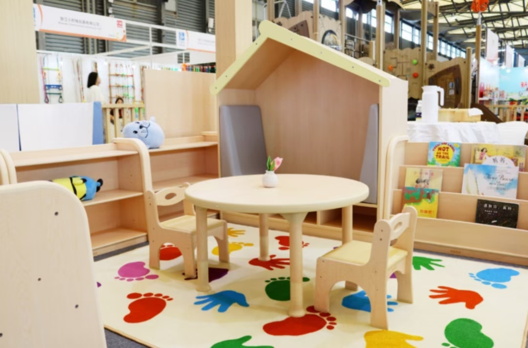 在婴幼儿家具组合区,上海凯思泰乐展示了其专为0-6岁婴幼儿设计的系列产品。圆润的倒角处理、环保的材质选用、温和的色彩搭配,每一个细节都体现了对婴幼儿安全的周全考虑。从独立小桌椅到多功能收纳柜,这些产品不仅满足了日常使用需求,更是支持婴幼儿迈向独立成长的重要工具。